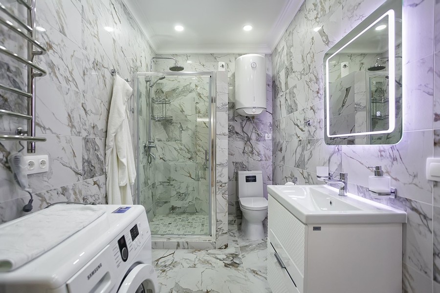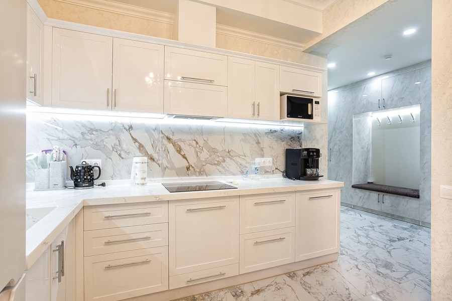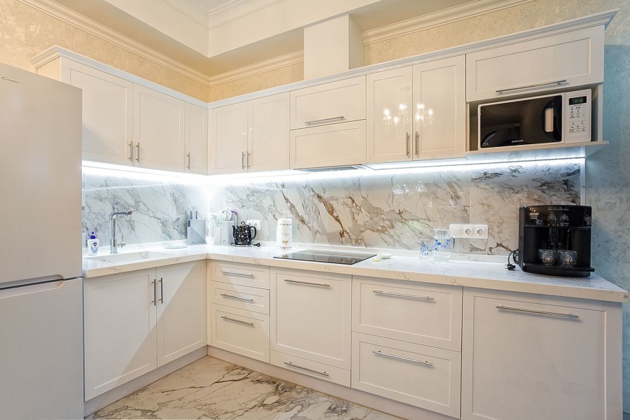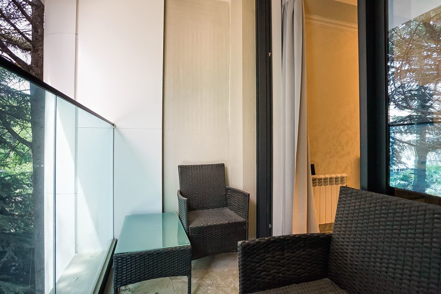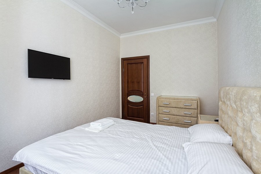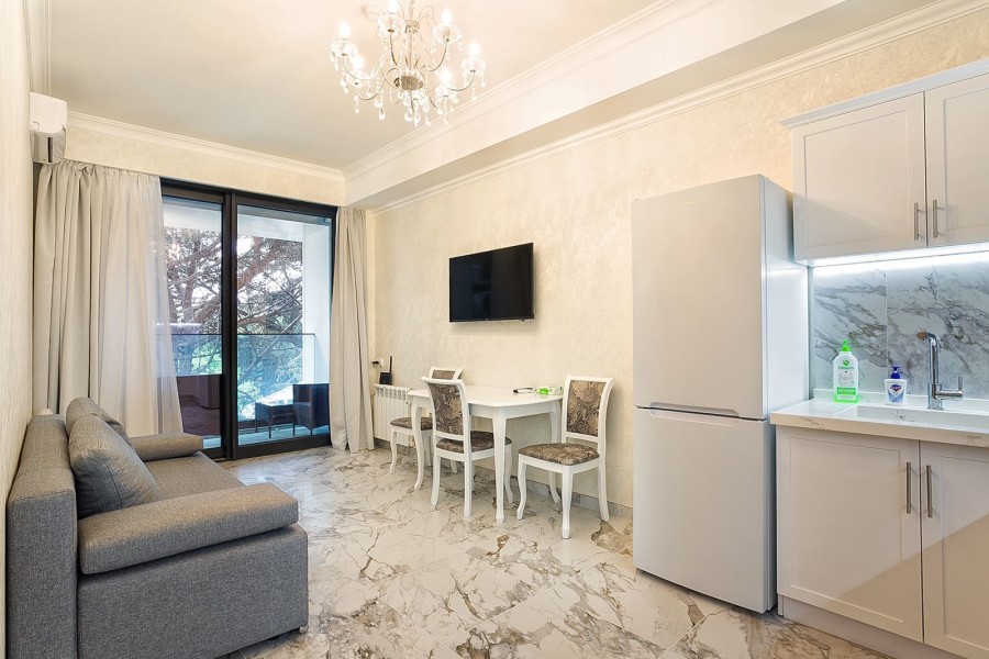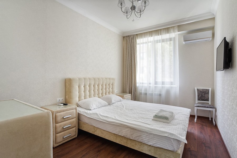 Двухкомнатные апартаменты с дизайнерским ремонтом, панорамным остеклением и своим балконам, расположены на 3 этаже. В апартаментах встроенная мебель и техника. На балконе стоит мягкая мебель для комфортного время препровождения. В апартаментах установлено 2 кондиционера, горячая вода и отопление подаётся крышной котельной. Апартаменты идеально подойдут для размещения 4 человек. Кухня: обеденный стол на 4 персоны, кухня укомплектована встроенной электроплитой на 4 комфорки, вытяжкой, микроволновой печью, холодильником, электрочайником, набором посуды и всеми необходимыми комплектующими для приготовления еды. Гостиная: большой раскладывающейся диван, плазменный телевизор SMART TV с выходом в интернет, утюг, гладильная доска, пылесос. Спальня: двуспальная кровать (BIG SIZE), встроенный шкаф-купе, 2 прикроватные тумбы. Санузел: ванная, настенная тумба с раковиной, унитаз, гигиенический душ, стиральная машина, фен для волос, полы с подогревом. В стоимость аренды апартаментов входит: 2 комплекта постельного белья, набор полотенец для каждого гостя (руки, ноги, банное), Wi-Fi, средство для мытья посуды, туалетная бумага, жидкое мыло, стиральный порошок, SMART TV.