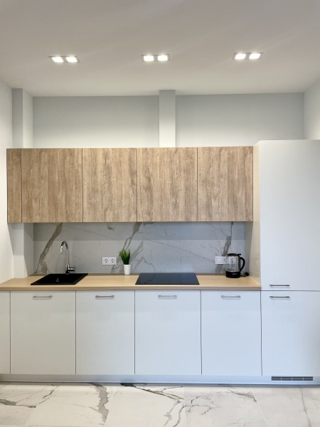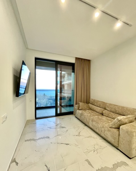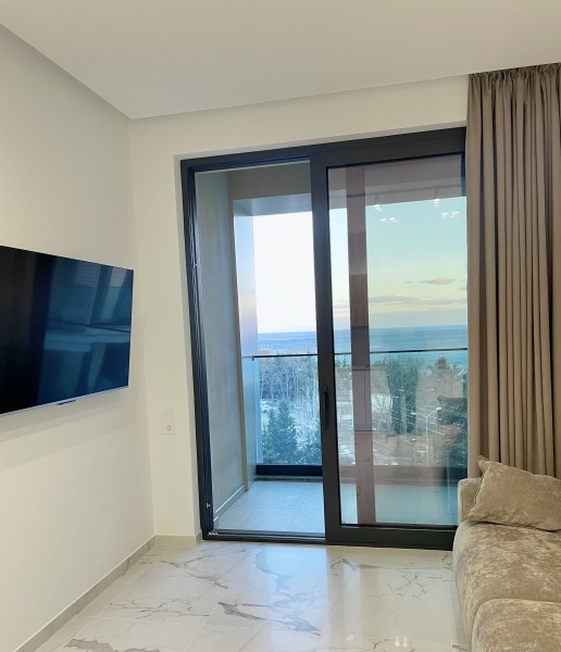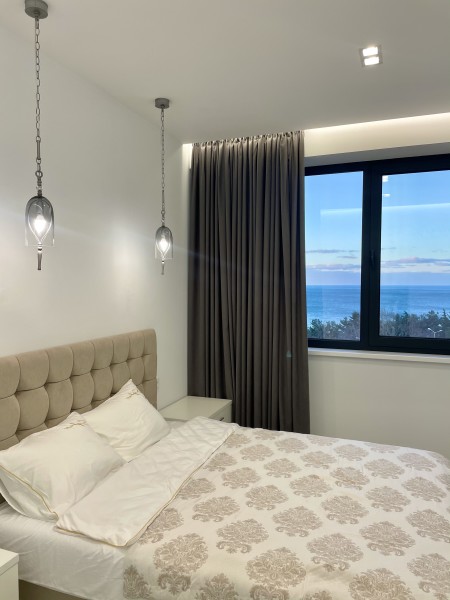 Двухкомнатные апартаменты с дизайнерским ремонтом, панорамным остеклением и своим балконам, расположены на 6 этаже. В апартаментах встроенная мебель и техника. В апартаментах установлено кондиционер, горячая вода и отопление подаётся крышной котельной. Апартаменты идеально подойдут для размещения 3 человек. Кухня: обеденный стол на 3 персоны, кухня укомплектована встроенной электроплитой на 4 комфорки, вытяжкой, микроволновой печью, холодильником, электрочайником, набором посуды и всеми необходимыми комплектующими для приготовления еды. Гостиная: большой раскладывающейся диван, плазменный телевизор SMART TV с выходом в интернет, утюг, гладильная доска, пылесос. Спальня: двуспальная кровать (BIG SIZE), встроенный шкаф-купе, 2 прикроватные тумбы. Санузел: ванная, настенная тумба с раковиной, унитаз, гигиенический душ, стиральная машина, фен для волос, полы с подогревом. В стоимость аренды апартаментов входит: 2 комплекта постельного белья, набор полотенец для каждого гостя (руки, ноги, банное), Wi-Fi, средство для мытья посуды, туалетная бумага, жидкое мыло, стиральный порошок, SMART TV.