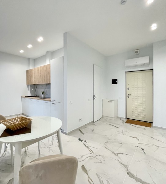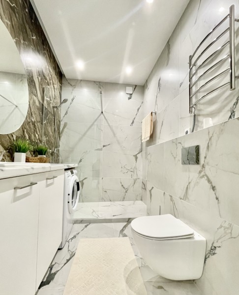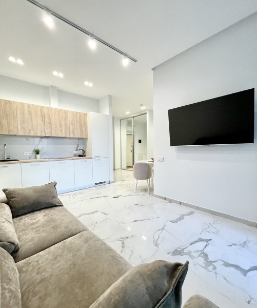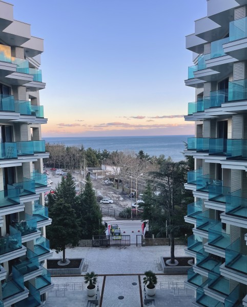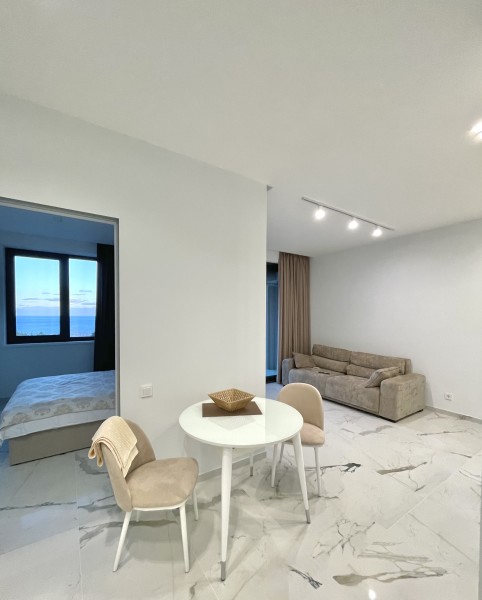 Двухкомнатные апартаменты с дизайнерским ремонтом, панорамным остеклением и своим балконам, расположены на 6 этаже. В апартаментах встроенная мебель и техника. В апартаментах установлено кондиционер, горячая вода и отопление подаётся крышной котельной. Апартаменты идеально подойдут для размещения 3 человек. Кухня: обеденный стол на 3 персоны, кухня укомплектована встроенной электроплитой на 4 комфорки, вытяжкой, микроволновой печью, холодильником, электрочайником, набором посуды и всеми необходимыми комплектующими для приготовления еды. Гостиная: большой раскладывающейся диван, плазменный телевизор SMART TV с выходом в интернет, утюг, гладильная доска, пылесос. Спальня: двуспальная кровать (BIG SIZE), встроенный шкаф-купе, 2 прикроватные тумбы. Санузел: ванная, настенная тумба с раковиной, унитаз, гигиенический душ, стиральная машина, фен для волос, полы с подогревом. В стоимость аренды апартаментов входит: 2 комплекта постельного белья, набор полотенец для каждого гостя (руки, ноги, банное), Wi-Fi, средство для мытья посуды, туалетная бумага, жидкое мыло, стиральный порошок, SMART TV.