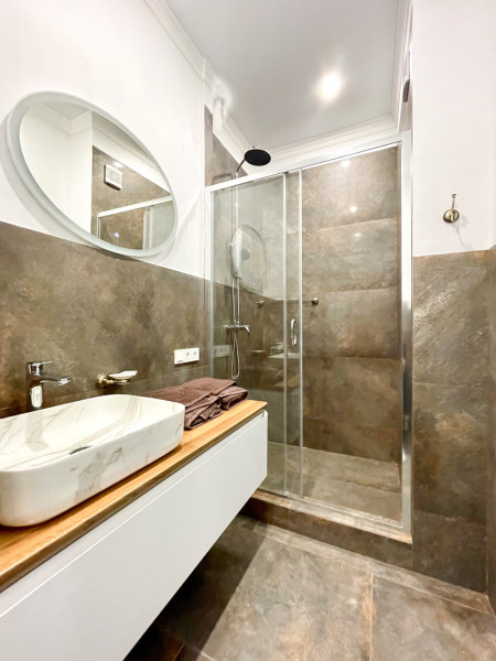Двухкомнатные апартаменты премиум-класса с панорамным остеклением расположены на 9 этаже откуда открывается незабываемый вид на море и Ялту. В апартаментах выполнен дизайнерский ремонт с встроенной мебелью и техникой. В апартаментах установлен кондиционер, горячая вода и отопление подаётся крышной котельной, установлен резервный боллер для воды. . Апартаменты идеально подойдут для размещения 4 человек. Кухня: большой обеденный стол на пять персон, кухня укомплектована встрой встроенной электроплитой, вытяжкой, духовым шкафом, микроволновой печью, холодильником, электрочайником, набором посуды и всеми необходимыми комплектующими для приготовления еды. Гостиная: большой раскладывающейся диван, шкаф под телевизор, плазменный телевизор SMART TV с выходом в интернет, утюг, гладильная доска. Спальня: двуспальная кровать (BIG SIZE), встроенный шкаф-купе, 2 прикроватные тумбы, плазменный телевизор. Санузел: просторная душевая кабинка с тропическим душем, настенная тумба с раковиной, унитаз, гигиенический душ, стиральная машина, фен для волос, полы с подогревом. В стоимость аренды апартаментов входит: 2 комплекта постельного белья, 2 комплекта полотенец (руки, ноги, пляж), Wi-Fi, средство для мытья посуды, туалетная бумага, жидкое мыло, стиральный порошок, SMART TV. Этаж: 9 Общая площадь: 56 м2. Площадь балкона: нет. Высота потолков: 3,2 м.
